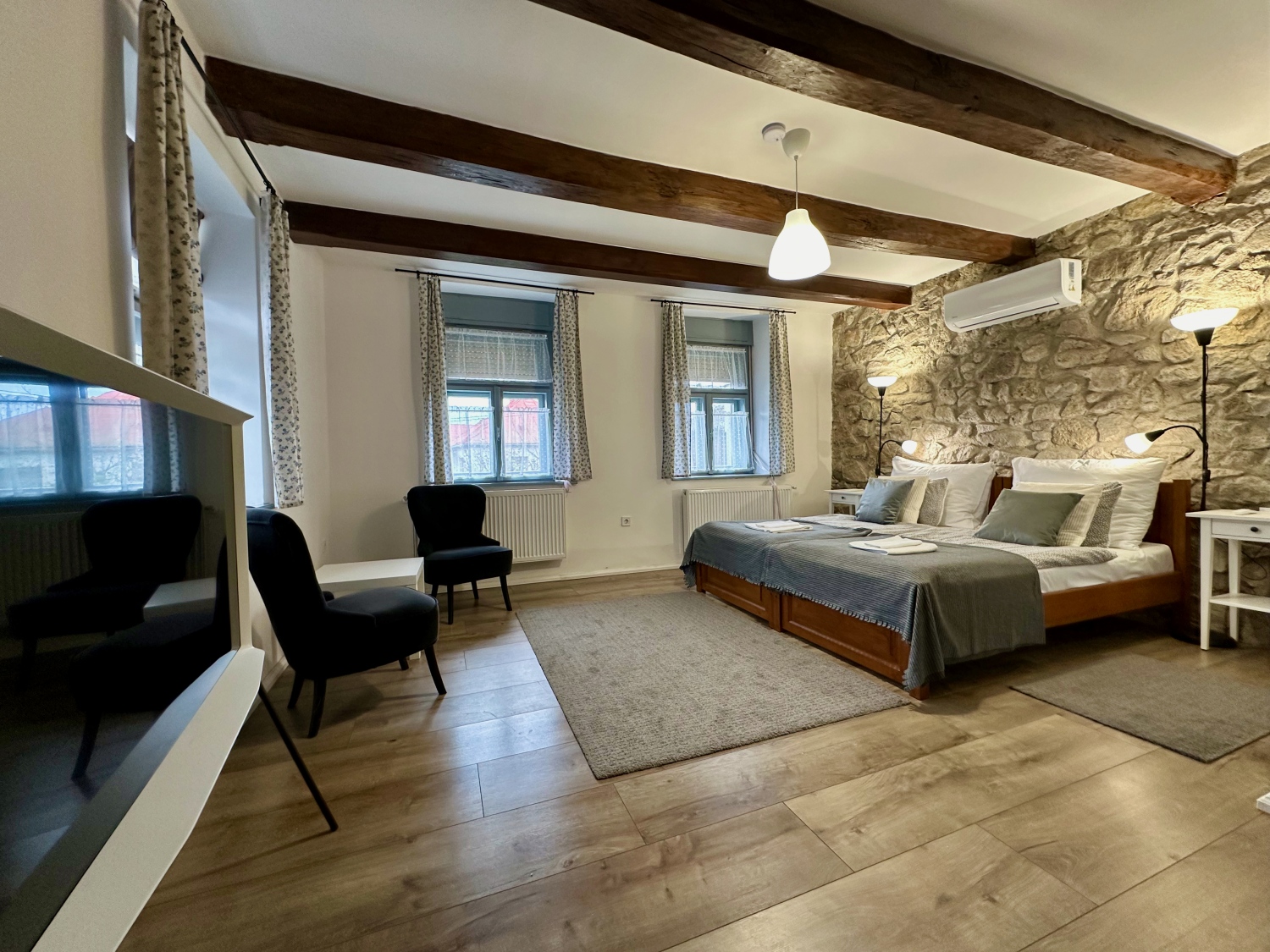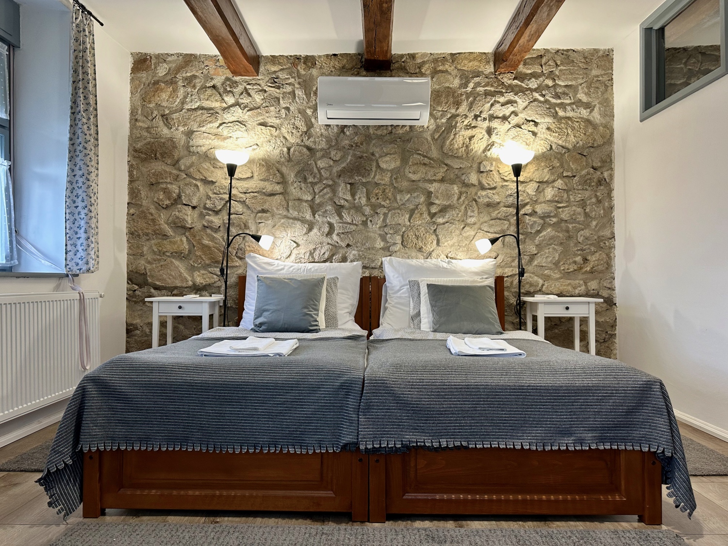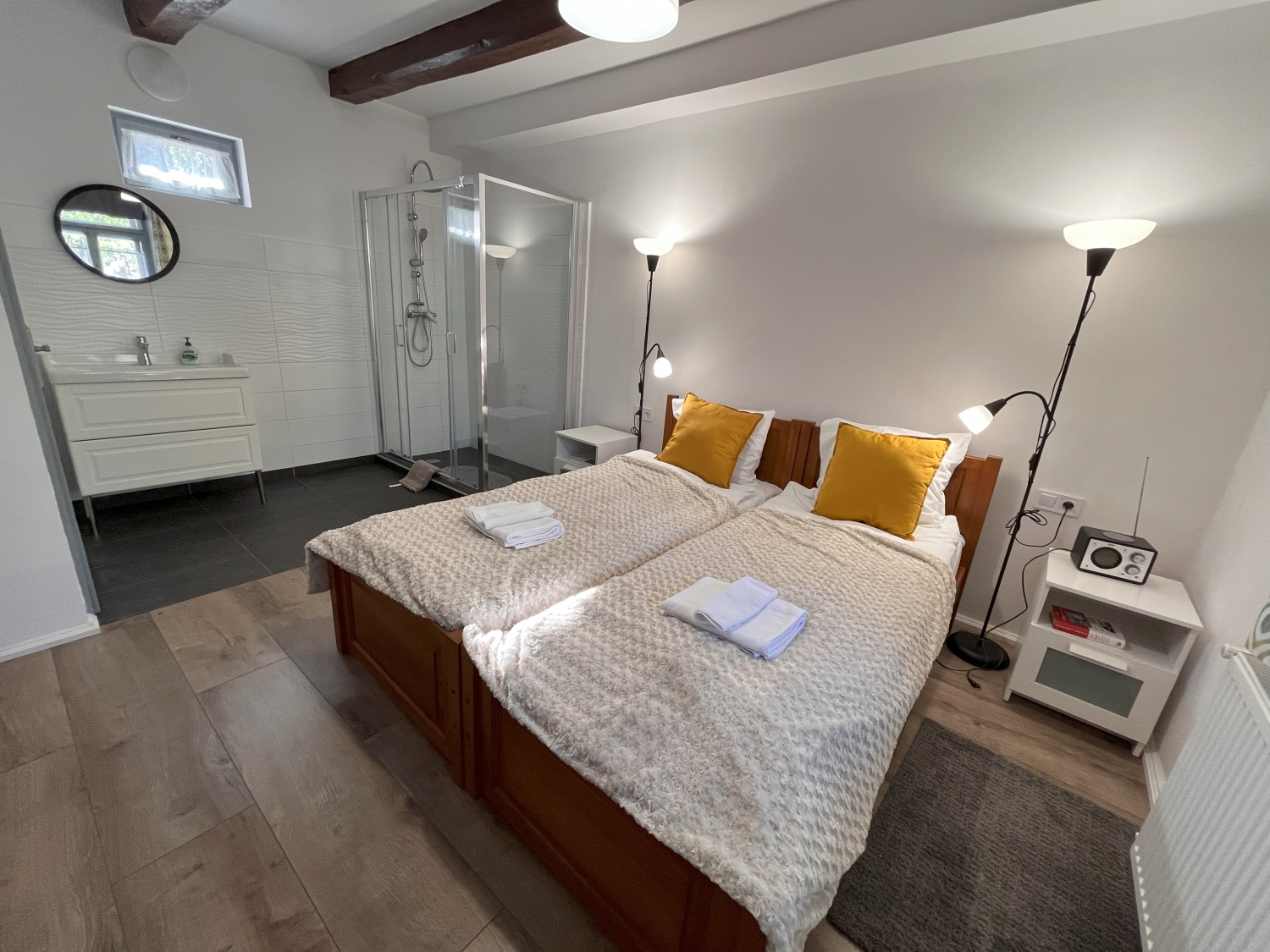 Az apartman egyik kétágyas hálószobája a ház elejében található. A szobában az összetolt ágyak mellett egy-egy éjjeliszekrény, két fotel dohányzóasztallal és egy ruhásszekrény található. Ebben a szobában szükség esetén egy pótágyat is el tudunk helyezni.