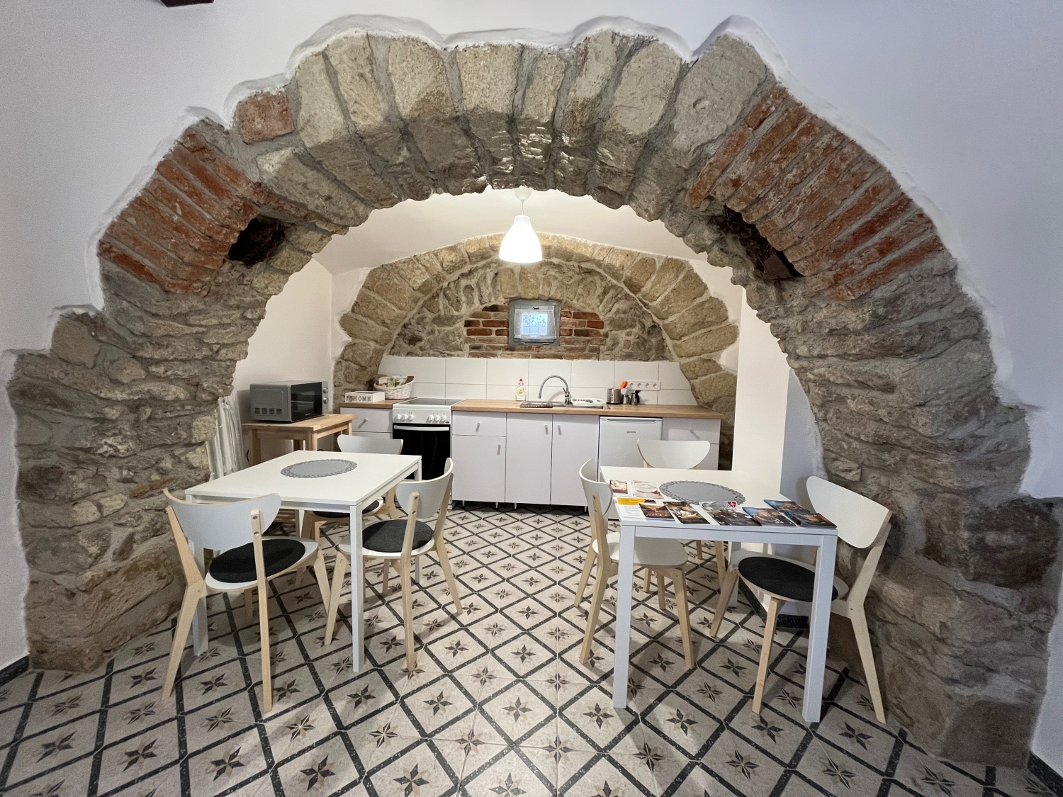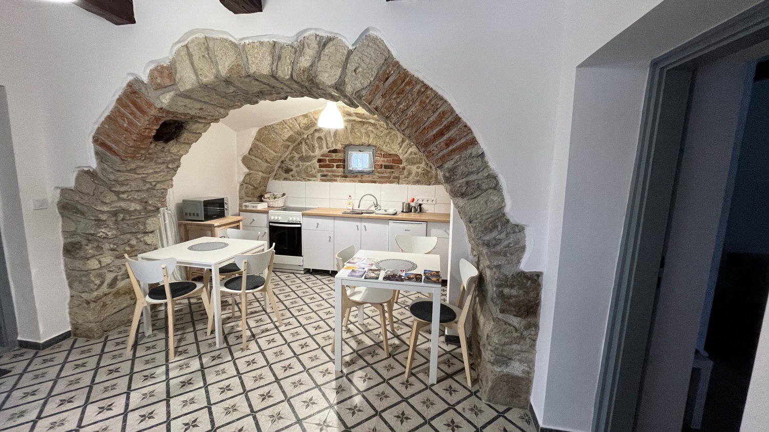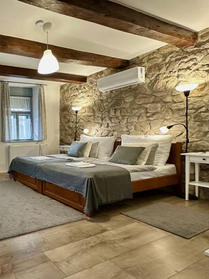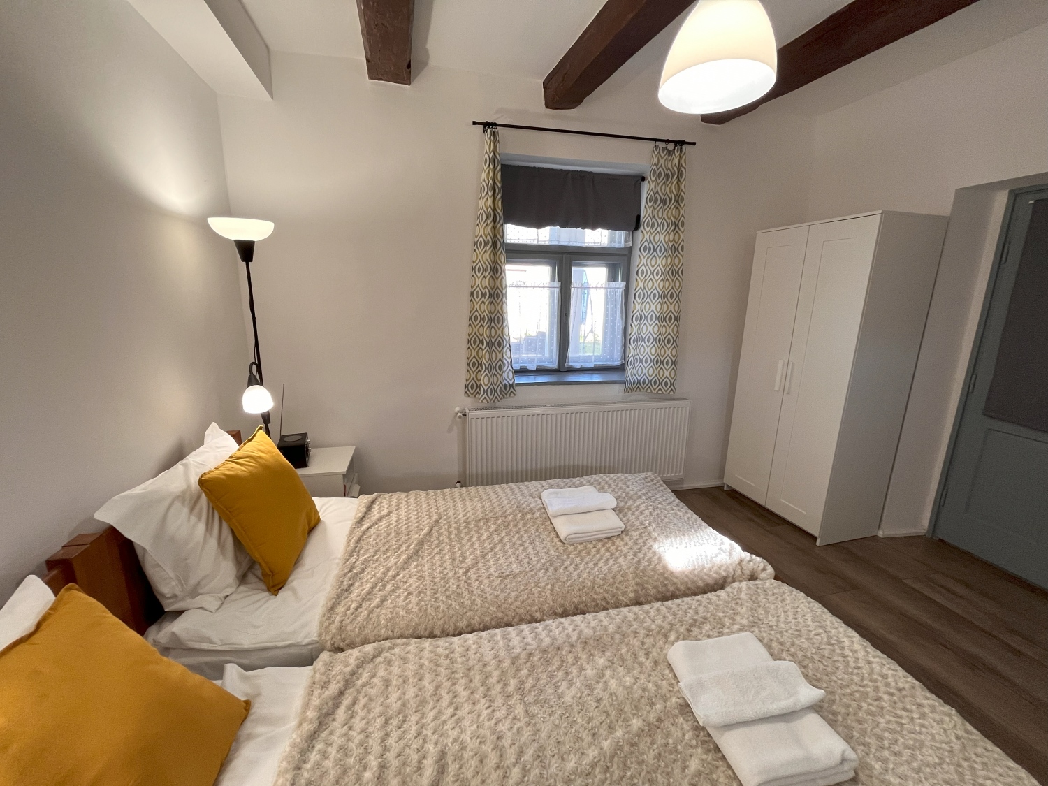 Az apartman egyik kétágyas hálószobája a ház elejében található. A szobában az összetolt ágyak mellett egy-egy éjjeliszekrény, két fotel dohányzóasztallal és egy ruhásszekrény található. Ebben a szobában szükség esetén egy pótágyat is el tudunk helyezni.